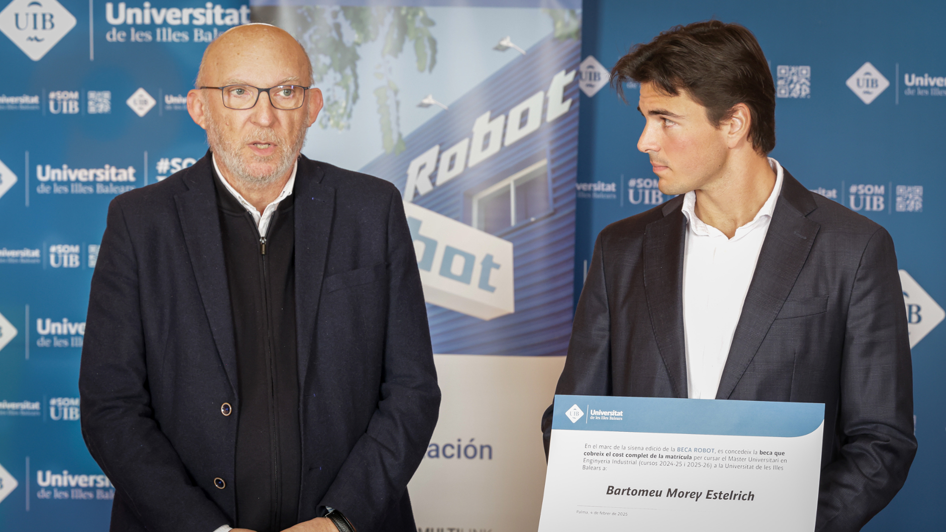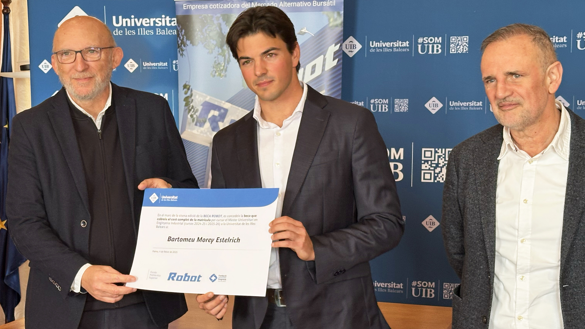 La ceremonia de entrega, presidida por el Presidente Ejecutivo de Robot S.A., Bernat Bonnín, tuvo lugar ayer, 4 de febrero, y contó con la asistencia de destacadas figuras de la Universitat de les Illes Balears, entre ellas el Dr. Jaume Carot, rector de la UIB; la Dra. Lorenza Carrasco, vicerrectora de Innovación y Transformación Digital; el Dr. Maurici Mus, vicerrector de Gestión y Política de Posgrado y Formación Permanente; el Dr. Antoni Mesquida, subdirector de la Escuela Politécnica Superior; el Dr. Víctor Martínez, director del Máster Universitario en Ingeniería Industrial; el Dr. Miquel Roca, director del Departamento de Ingeniería Industrial y Construcción; el Dr. Ramon Pujol, jefe de Estudios del Grado en Ingeniería Electrónica; y el Sr. Luis Vegas, director gerente de la FUEIB.